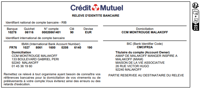 Voici le RIB de notre association.