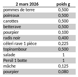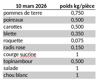 Pour un foyer d’1-2 personnes : choisir une part de récoltes toutes les 2 semaines.